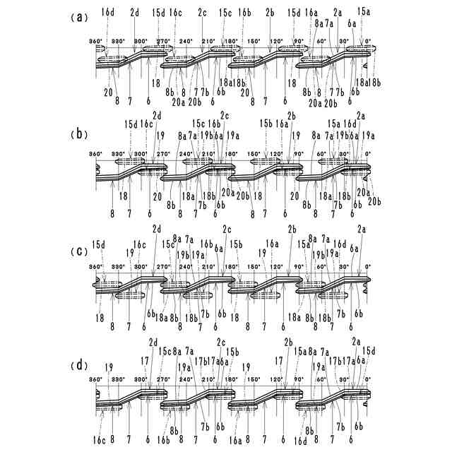 本発明の第1実施例である容器本体のスロープねじ部とねじキャップのキャップねじ突部との作用図で、(a)は開閉操作時の螺合されてない状態、(b)は螺合初期または螺合が外れる前、(c)は螺合中期、(d)は螺合完了時である。