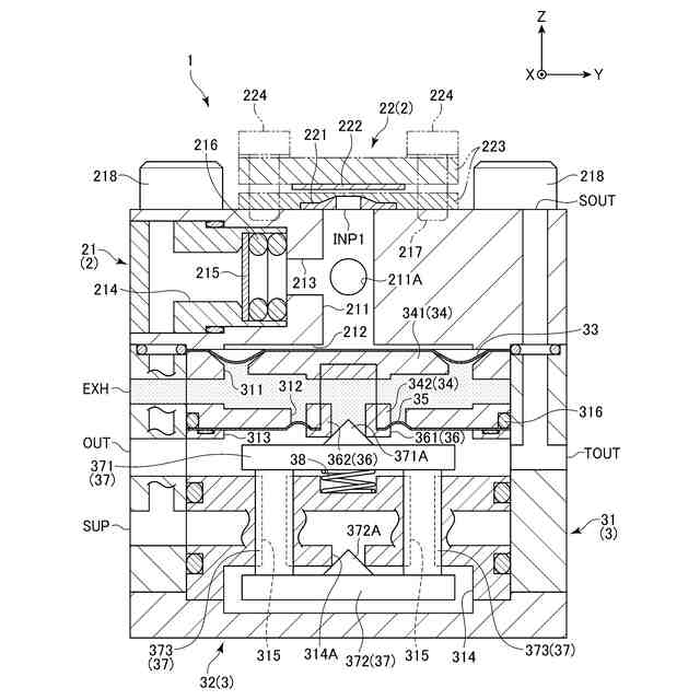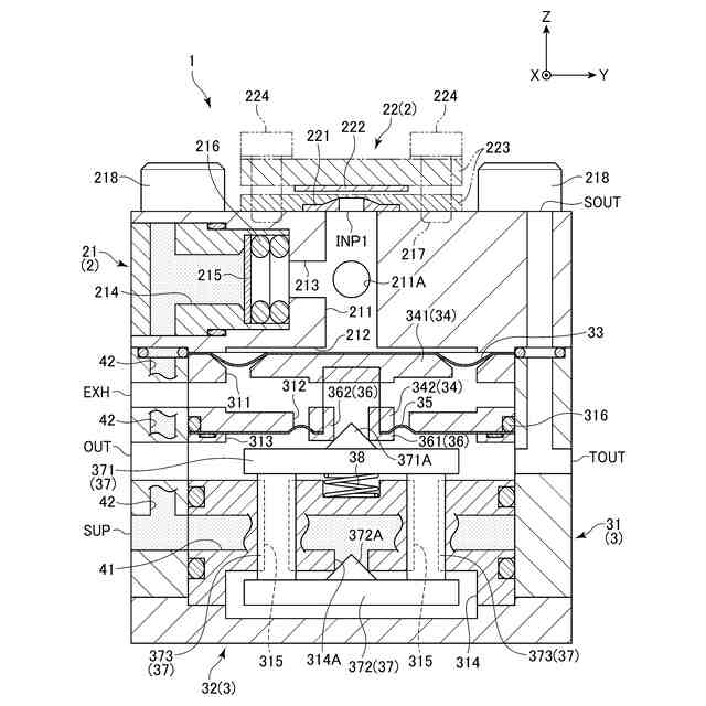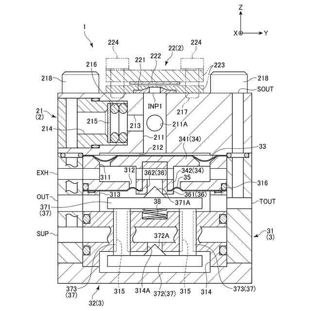 ここで、可動体は、複数のロッドを介してポペットに接続されており、このポペットは、供給圧側の空間と、出力圧側の空間とを連通する連通穴を閉塞するように配置されるOリングを有している。この可動体は、第1の圧力板に印加される信号圧に基づいて移動するので、信号圧の変化に基づいてポペットを連通穴に対して近接または離間させることになる。そして、調整弁は、信号圧を上昇させることによって、ポペットを連通穴に対して離間させることができるので、出力圧側の空間に供給圧を流通させることができ、ひいては出力圧を上昇させることができるようになっている。