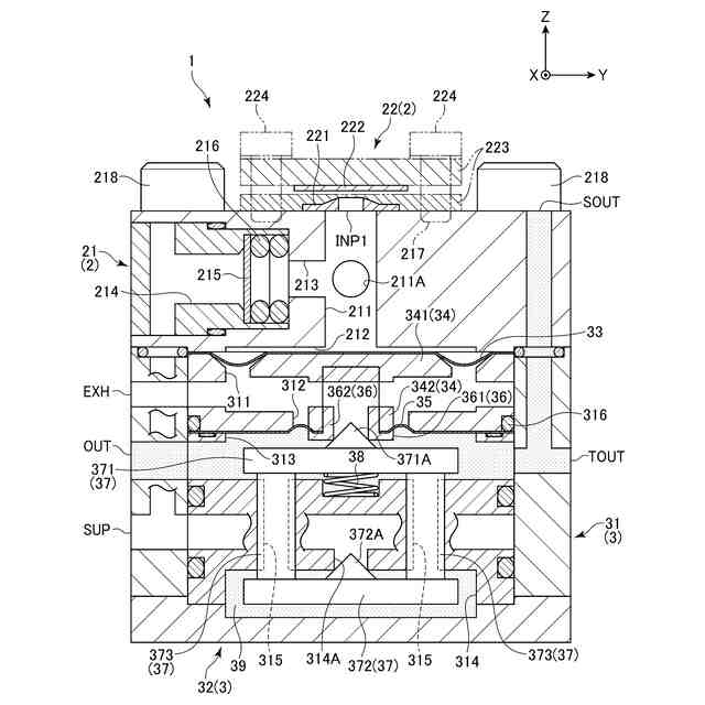 従来、外部から供給される供給圧を電気信号に応じた信号圧として取得し、この信号圧を入力として出力圧を調整する調整弁が知られている。例えば、特許文献1に記載された調整弁は、外部から供給される供給圧を電気信号に応じた信号圧として取得する電磁式ノズルフラッパと、この信号圧を入力として出力圧を調整するブースター(弁本体)とを備えている。