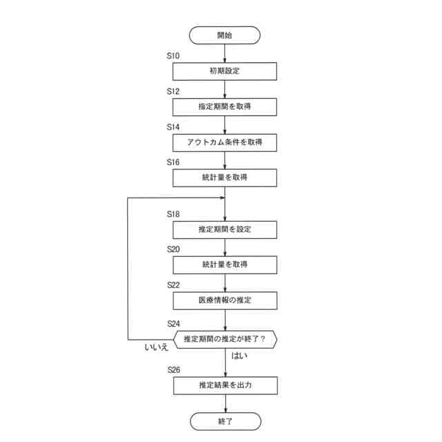 また、前記推定手段は、前記第2集団の統計量を前記第1の期間において前記第1医療データにおいて前記アウトカム条件に合致する前記第1集団の統計量で除算した係数を算出し、前記推定期間について前記第1医療データにおいて前記アウトカム条件に合致する前記第1集団の統計量に当該係数を乗算して前記推定期間における前記第2集団の統計量を推定し、前記第3集団の統計量を前記第1の期間において前記第1医療データにおいて前記アウトカム条件に合致する前記第1集団の統計量で除算した係数を算出し、前記推定期間について前記第1医療データにおいて前記アウトカム条件に合致する前記第1集団の統計量に当該係数を乗算して前記推定期間における前記第3集団の統計量を推定することが好適である。