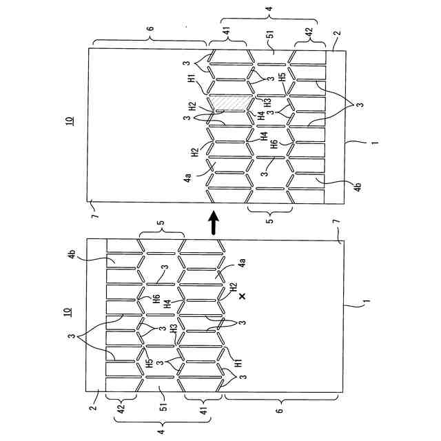 上記の目的を達成するために、本発明に係る金属化フィルムコンデンサは、誘電体フィルムのフィルム面上に形成される金属蒸着電極が、非蒸着の絶縁スリットにより前記誘電体フィルムの長手方向に分割された複数の分割電極からなる分割電極部と、前記分割電極よりも電極面積が大きい大電極部とに区画され、前記分割電極部と前記大電極部とが前記誘電体フィルムの幅方向に交互に配置され、前記複数の分割電極は、それぞれ多角形状からなり、前記複数の分割電極のうち前記長手方向に隣接する2つの分割電極は、その頂点において互いに電気的に接続されるようにヒューズ部を共有するとともに、当該ヒューズ部が前記大電極部と電気的に接続されていることを特徴としている。