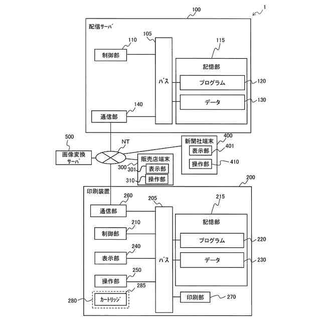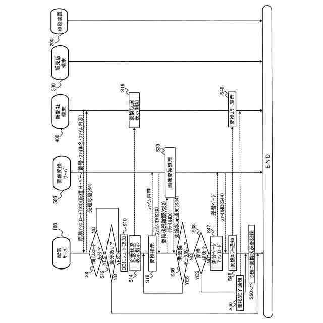 配信サーバ、画像変換サーバ、新聞社端末、販売店端末、及びプリンタにより実行される処理の流れの一例を表すシーケンスフローである。