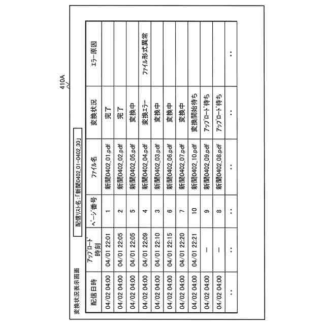 新聞社端末が表示部に表示する変換状況表示画面の一例を表す説明図である。