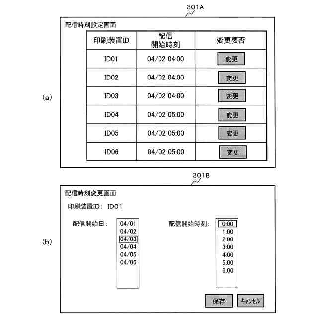 販売店端末において各印刷装置の配信時刻を設定するための配信時刻設定画面を表す説明図、及び、配信時刻を変更するための配信時刻変更画面を表す説明図である。