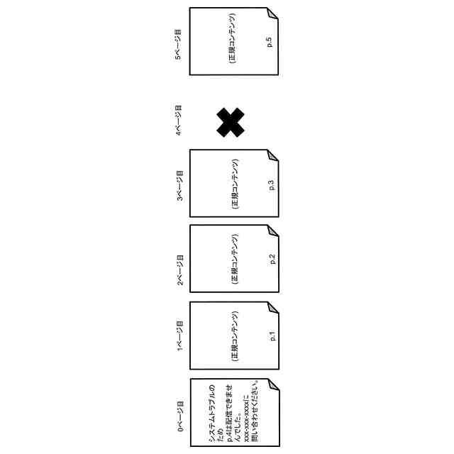 画像変換に成功した本来の正規コンテンツと、画像変換に失敗して差し替えられた所定内容の印刷ページと、を混在して含む印刷物の別例を表す説明図である。