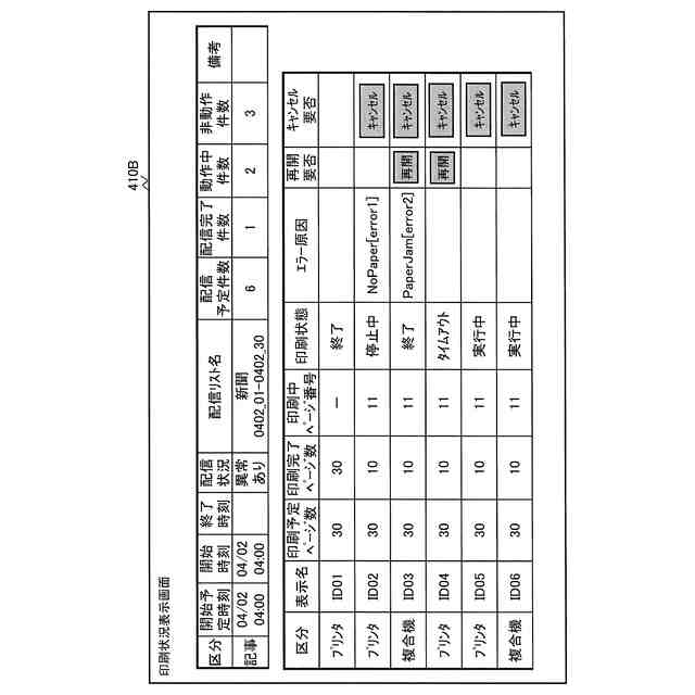 新聞社端末が表示部に表示する印刷状況表示画面の一例を表す説明図である。