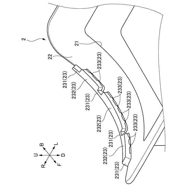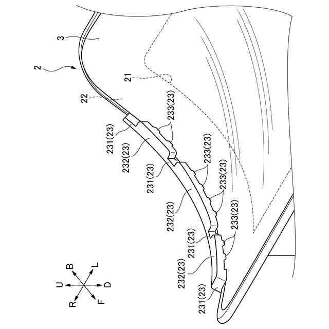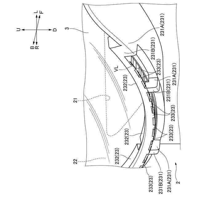 前記上面部の側面を第一方向から見たとき、前記湾曲部は、湾曲しており、前記二つの直線部は、前記湾曲部の両端から前記湾曲部の縁部の接線方向に延びている。