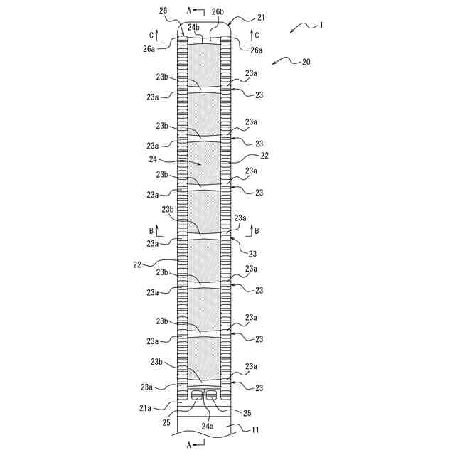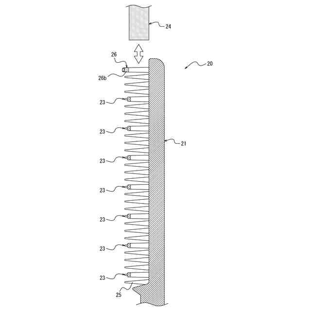 それぞれ、各列において隣り合う前記櫛歯の間に設けられた一対の柱部と、一方の列の前記柱部と他方の列の前記柱部とに連なる橋部と、を有する複数の橋掛け部と、