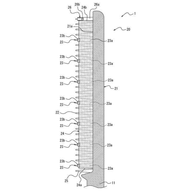 二列の前記櫛歯の間において複数の前記橋掛け部に挿通されて前記基台に配置された前記含侵体と、