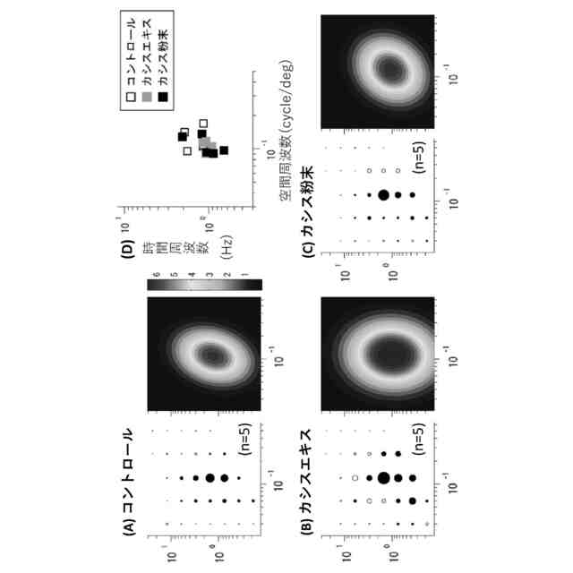 実施例1の各群の視運動性応答の平均速度の大きさをガウス関数でフィットした結果を示す図である。(A)はコントロール群、(B)はカシスエキス群、(C)はカシス粉末群、(D)は各マウスの最適時空間周波数のプロットである。縦軸は時間周波数(Hz)、横軸は空間周波数(cycle/deg)を示す。