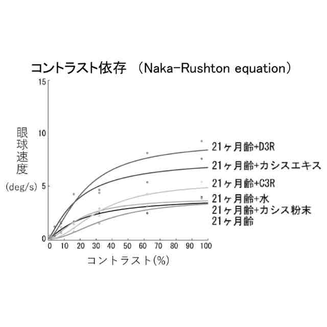 実施例1および実施例2で示したコントラスト感度の結果を示す図である。縦軸は眼球速度(deg/s)、横軸はコントラスト(%)を示す。