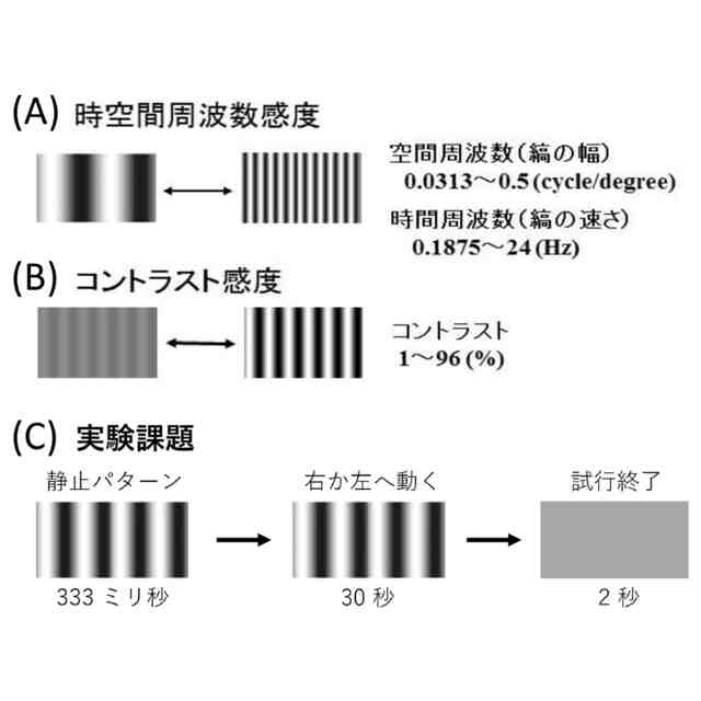 視運動性応答測定で使用した視覚刺激の説明図である。(A)は時空間周波数感度の測定に使用した垂直方向の正弦波縞の空間周波数(縞の幅)と時間周波数(縞の速さ)の説明図である。(B)はコントラスト感度の測定に使用した視覚刺激の説明図である。(C)は1回の試行における刺激開始から刺激終了までの説明図である。