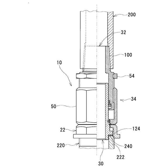 変化部34は、一方筒体30の一端が他方筒体32内に進入した際における、他方筒体32の軸線110に沿う方向についての他方筒体32の内部への一方筒体30の一端の進入量を変化せしめる。これにより、接続される物200,220の間の距離の調整が困難であっても、それら接続される物200,220への接続に要する労力は軽減される。