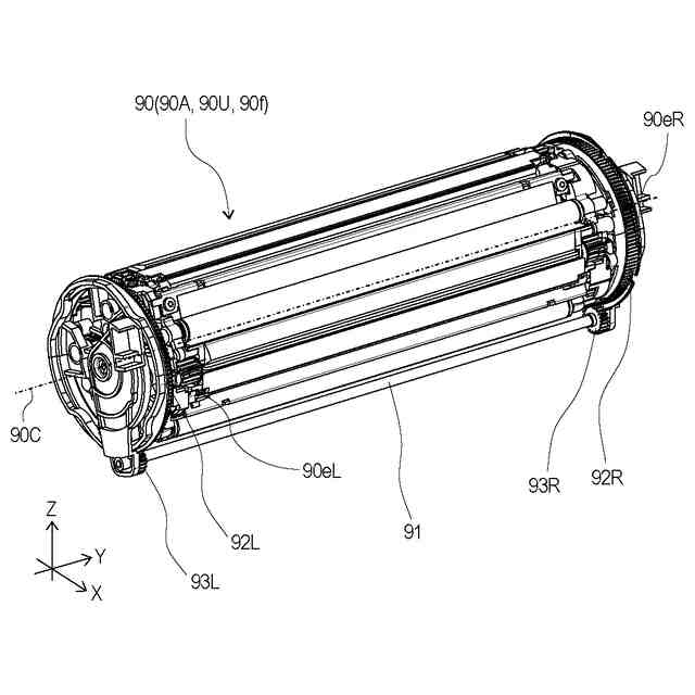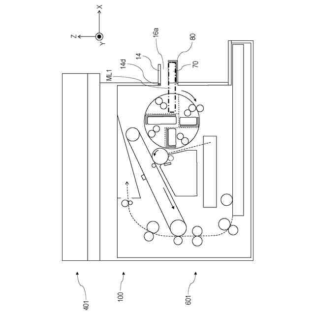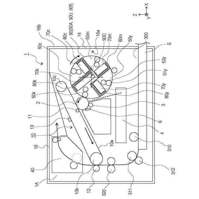 図1~図12(a、b)を用いて、実施例1に係る画像形成装置1について説明する。以下の説明及び各図面において、画像形成装置1が水平面に設置された場合の鉛直方向をZ方向とする。Z方向と交差する方向であって、後述するロータリ本体90の回転軸線90Cの方向(ロータリの回転軸線方向)をY方向とする。Z方向及びY方向の双方と交差する方向をX方向とする。X方向及びY方向は、好ましくは水平方向である。また、X方向、Y方向、Z方向は、好ましくは互いに直交する。また、必要に応じ、各図面に図示した矢印X、Y、Zの方向をそれぞれ+X側、+Y側、+Z側と表し、その反対側をそれぞれ-X側、-Y側、-Z側と表す。