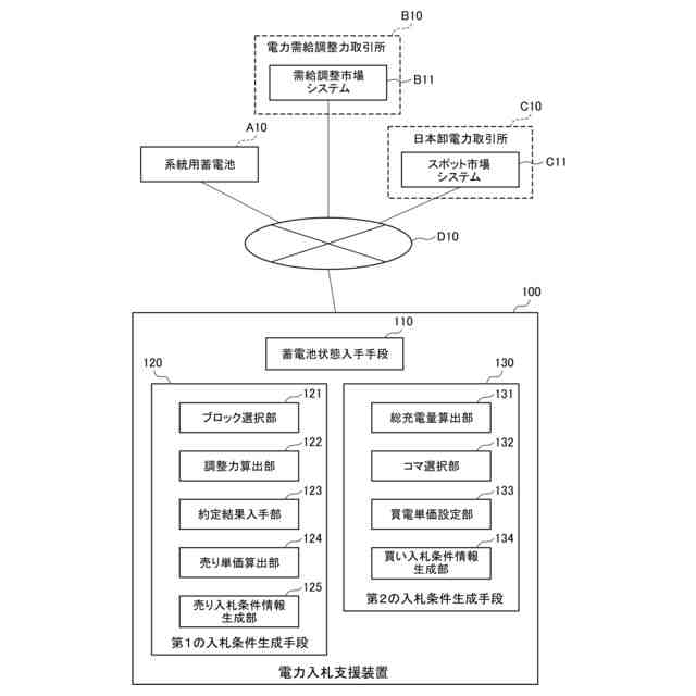 請求項1に係る発明は、系統用蓄電池の状態に基づいた電力入札を支援する電力入札支援装置であって、電力需給調整力取引所の需給調整市場における第1の三次調整力の取引における売り入札条件情報を生成する第1の入札条件生成手段と、前記需給調整市場における約定結果に基づいて日本卸電力取引所のスポット市場における買い入札条件情報を生成する第2の入札条件生成手段とを備え、前記売り入札条件情報が、前記需給調整市場において区切られた時間帯であるブロックのうちから入札対象として選択された入札対象ブロックと、該入札対象ブロックにおける前記系統用蓄電池による入札可能調整力と、前記入札対象ブロックにおける売り単価とを含み、前記買い入札条件情報が、前記スポット市場において区切られた時間帯であるコマのうちから入札対象として選択された入札対象コマと、該入札対象コマにおける前記系統用蓄電池への充電量と、前記入札対象コマにおける買電単価とを含んでいることにより、前述した課題を解決するものである。