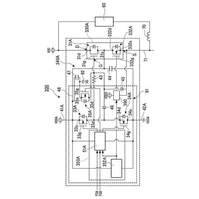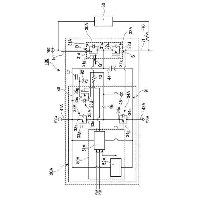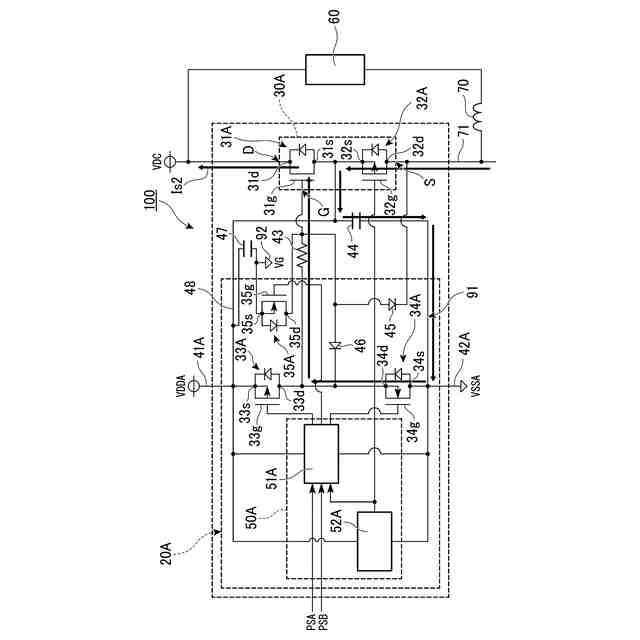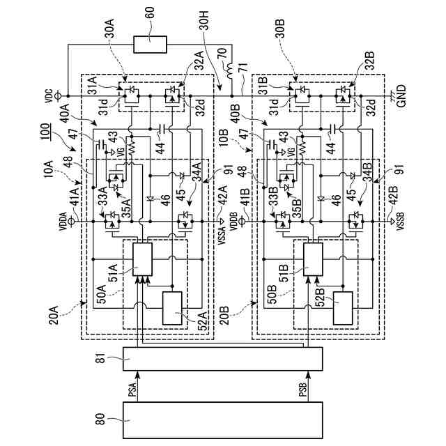 図1に示すように、第1の実施形態において半導体装置100は、2つの半導体パッケージ10A,10Bを備える。半導体パッケージ10Aと半導体パッケージ10Bとは、外部負荷60に電力を供給する電源VDCとグランドGNDとの間に互いに直列接続されて設けられている。半導体パッケージ10Aは、電源VDCに繋がるハイ側の半導体パッケージである。半導体パッケージ10Bは、グランドGNDに繋がるロー側の半導体パッケージである。第1の実施形態において外部負荷60は、電源VDCに対して半導体パッケージ10Aと並列に接続されている。半導体パッケージ10Aと半導体パッケージ10Bとを繋ぐ配線部71と、外部負荷60との間には、コイル70が配置されている。配線部71は、後述するトランジスタ回路30Aとトランジスタ回路30Bとを繋ぐ配線部である。