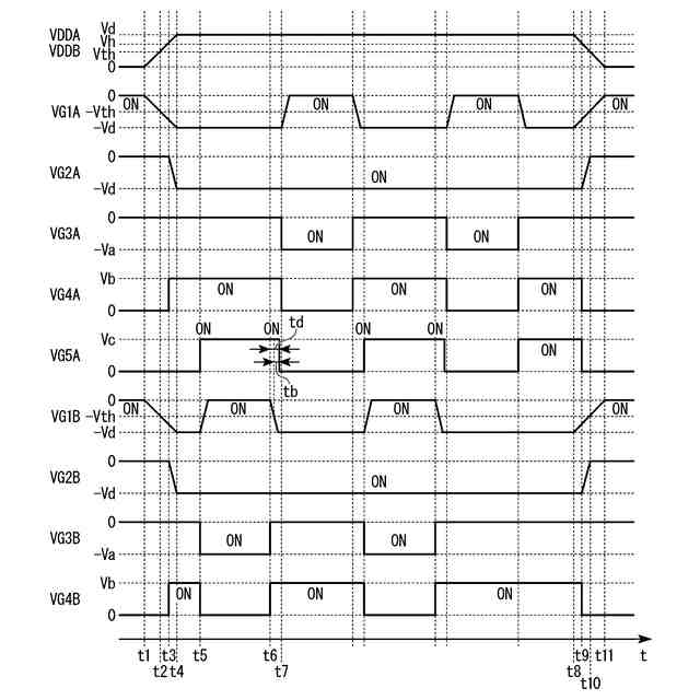 第2の実施形態のトランジスタ回路がON状態とOFF状態とで切り替えられる際における電源電圧と各トランジスタのゲート電圧との関係の一例を示すタイミングチャート。