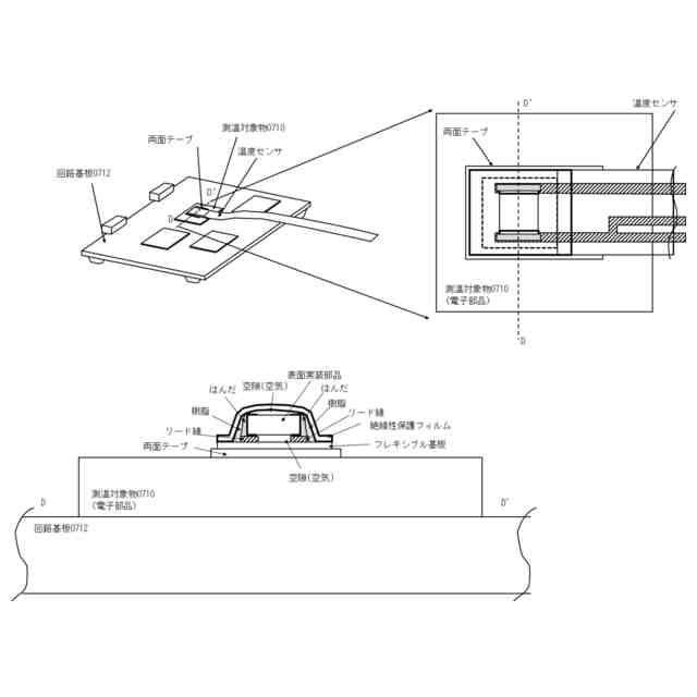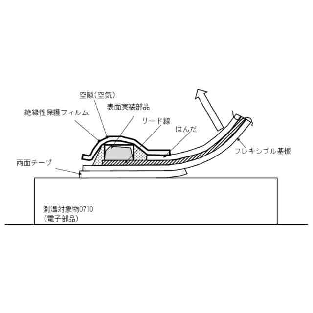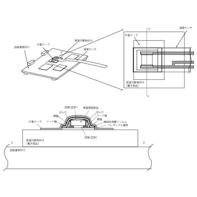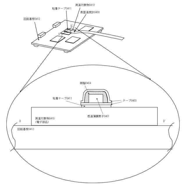 電気製品を制御する回路基板に搭載された電子部品には通電動作時に発熱するものがある。一方で電子部品には高温時では正常動作できなかったり部品寿命が短くなってしまったりするものもある。通電動作時に発熱する電子部品Aによる、高温時に正常動作できないまたは部品寿命が短くなるような電子部品Bへの影響を調べるために、電子部品Bの表面に温度計を付けてその温度を測定するといったことが行われてきた。特に筐体に実装された状態で評価する場合には測定対象である前記電子部品B周囲に大きな空隙がない場合もあり、薄型の表面温度計が開発され使用されてきた。