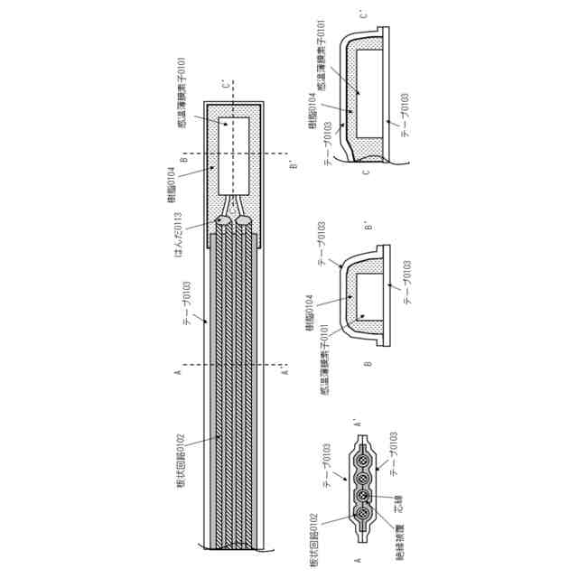 前記感温薄膜素子の少なくとも上下面の一部[渡邊 亨1][a2]を前記テープの上下間で被覆する樹脂と、