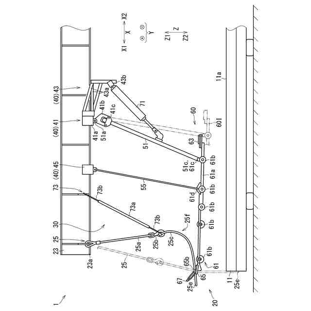 吊装置1は、図1に示すように、吊荷11を吊り上げ、吊荷11を移動させる装置である。例えば、吊装置1は、岸壁および船倉内で吊荷11を移動させるものでもよく、建物内で吊荷11を移動させるものでもよく、建設現場などで吊荷11を移動させるものでもよい。吊装置1は、吊荷11と、主ロープ13と、主フック15と、吊具20と、を備える。