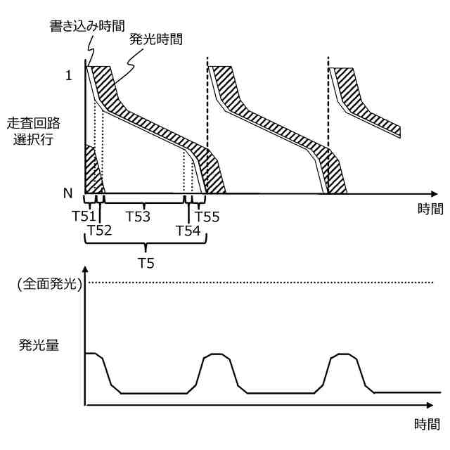 従来技術に係る表示装置の書き込みと発光の制御を模式的に示す図
