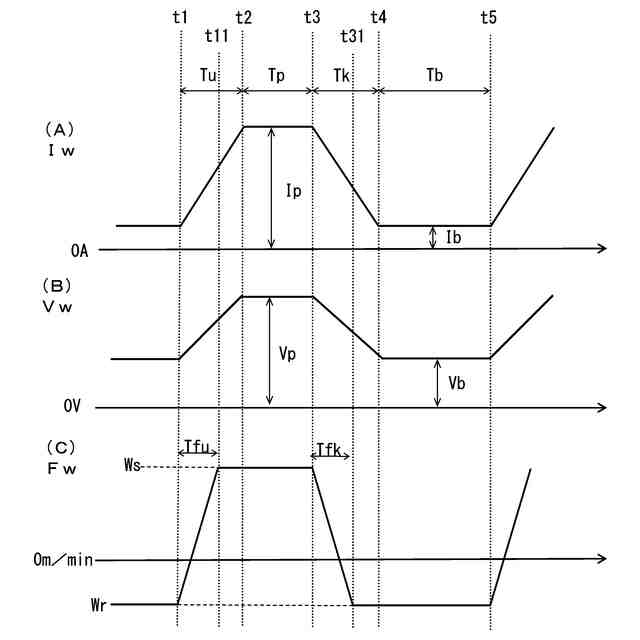 一例として、前記溶接ワイヤの送給速度は、前記ピーク立上り期間の開始時点で逆送ピーク値から正送ピーク値への変化を開始し、前記ピーク立下り期間の開始時点で前記正送ピーク値から前記逆送ピーク値への変化を開始する、ことを特徴とする。
