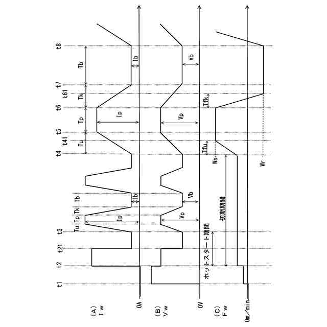 特許文献1の発明では、ピーク期間中の第1の時点からベース期間中の第2の時点までの所定期間の間は、溶接ワイヤの送給速度を、ピーク電流の立ち上がり時点の送給速度よりも低くする、あるいは、溶接ワイヤを溶接対象物から引き離す方向に送給する逆送としている。