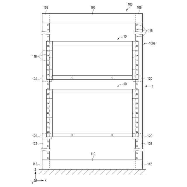 ラック100には、図1及び図2に示すようにXYZ直交座標系を設定する。なお、図1及び図2中、ラック100の筐体100aにサブラック10を取り付ける際に用いる雄ネジ又はボルト(以下、これらを主としてネジと称する)の図示を省略する。なお、雄ネジとしては、例えば、座金組込みネジや、つまみネジを用いることができる。