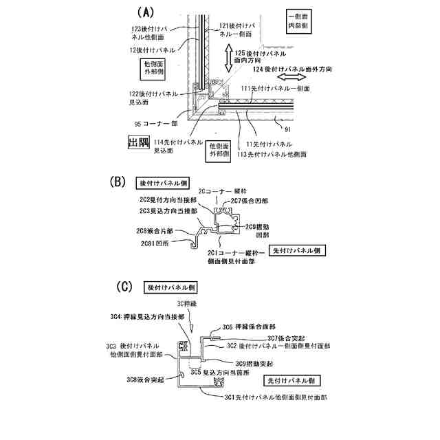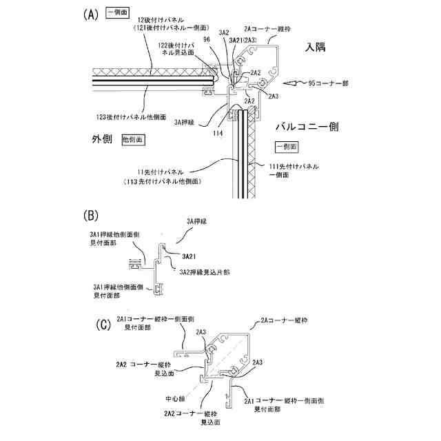 図3は、実施例Aのコーナー部の説明図である。図3(A)は入隅となるコーナー部の断面であり、図3(B)は押縁の平面図であり、図3(C)はコーナー縦枠の平面図である。
