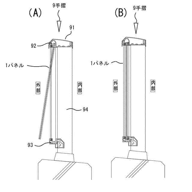 図2は、手摺9の構造の説明図である。図2(A)は手摺9の上桟92と下桟93にパネル1を嵌める説明図である。手摺9は、支柱94に支えられた上桟92と下桟93を有する。上桟92の上部は、笠木91が取り付けられている。パネル1は、上桟92と下桟93の間にケンドンで取り付けられる。図2(B)は手摺9にパネル1が取付けられた状態の説明図である。