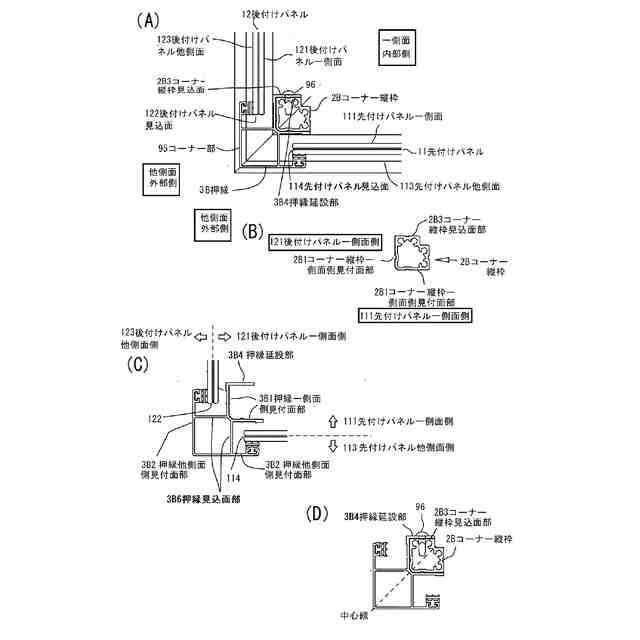 コーナー縦枠は、先付けパネル及び後付けパネルの一側面に各々対向する一側面側見付面部と、先付けパネル及び後付けパネルの見込面に各々対向する見込面部を有し