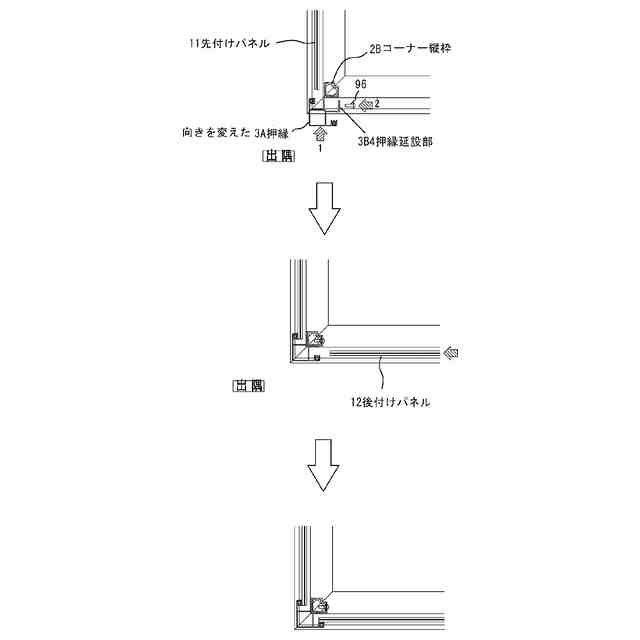 押縁3Bが先付けパネル11の端面に向かって押し込まれ、延設部3B4がコーナー縦枠2Bの後付けパネル12側の見込面部2B3に重合して押縁3Bがコーナー縦枠2Bに取り付けられる手摺9とすることで課題を解決した。