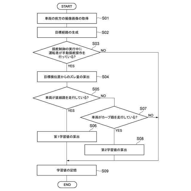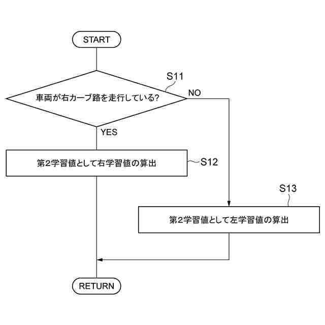 一実施形態において、学習値算出部は、車両が右カーブ路を走行しているときの第2学習値である右学習値と、車両が左カーブ路を走行しているときの第2学習値である左学習値と、を算出してもよい。取付姿勢のズレが車両横位置の誤差に対して与える影響は、車両が右カーブ路を走行しているときと、車両が左カーブ路を走行しているときと、で必ずしも一律ではない。上記構成によれば、右カーブ路用の右学習値と左カーブ路用の左学習値とは、互いに異なる値として算出され得る。したがって、取付姿勢のズレに起因した車両横位置の誤差に対して、右カーブ路と左カーブ路とでの影響の大きさの違いに対応して、それぞれの第2学習値を算出することができる。