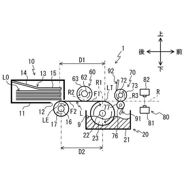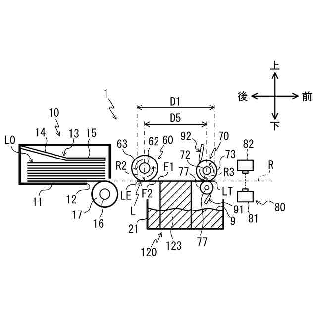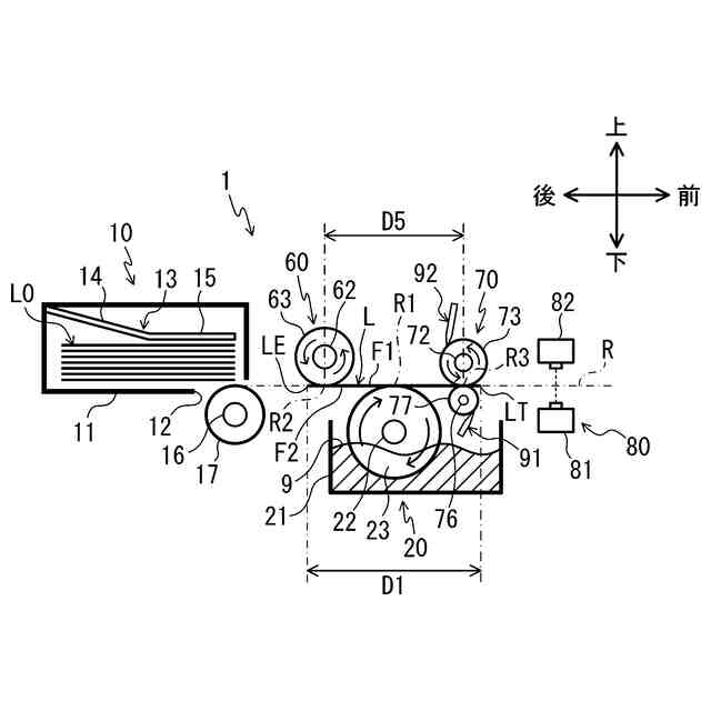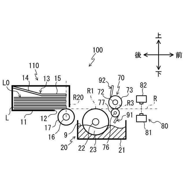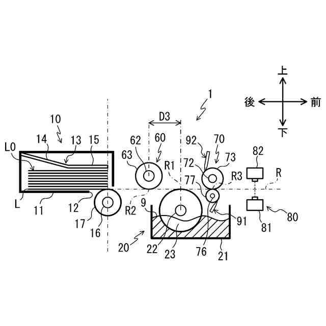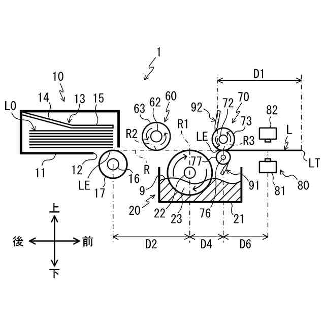 裏面に水溶性粘着剤層が設けられたラベルに水を付ける水付け装置が知られている。特許文献1に記載の水付け装置は液槽と、回転ローラと、押圧ばねとを有する。液槽は水を収容する。回転ローラは液槽内に水平に軸支した回転軸の周りを回転可能である。押圧ばねは回転ローラの上方に設けられ、回転ローラに上方から接触する。回転ローラを回転してラベルを搬送すると、回転ローラと押圧ばねとの間でラベルが挟持され、回転ローラに付着した液槽の水がラベルの裏面に付けられる。