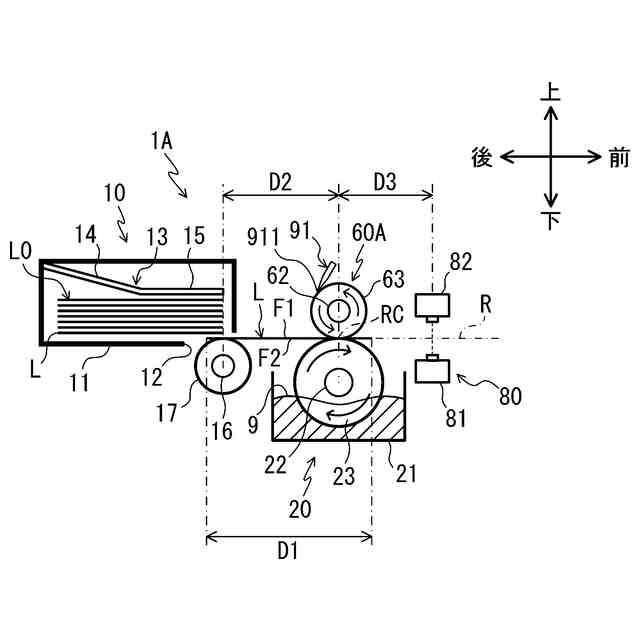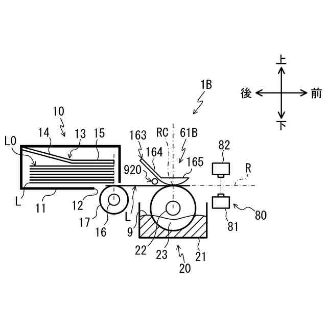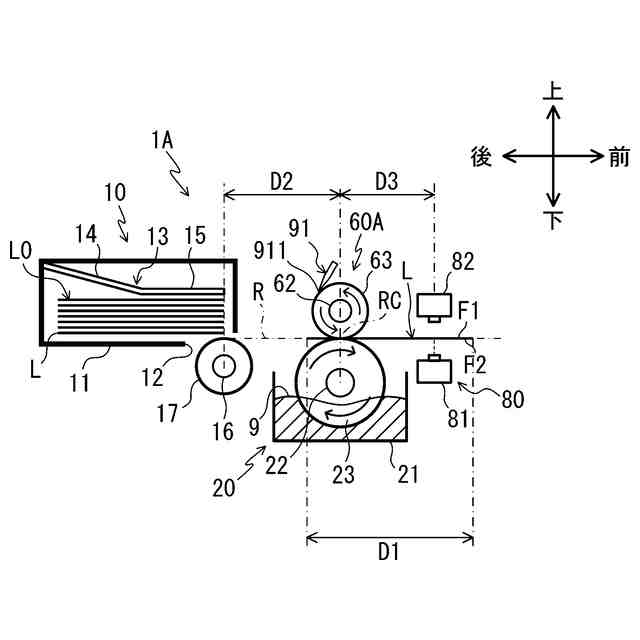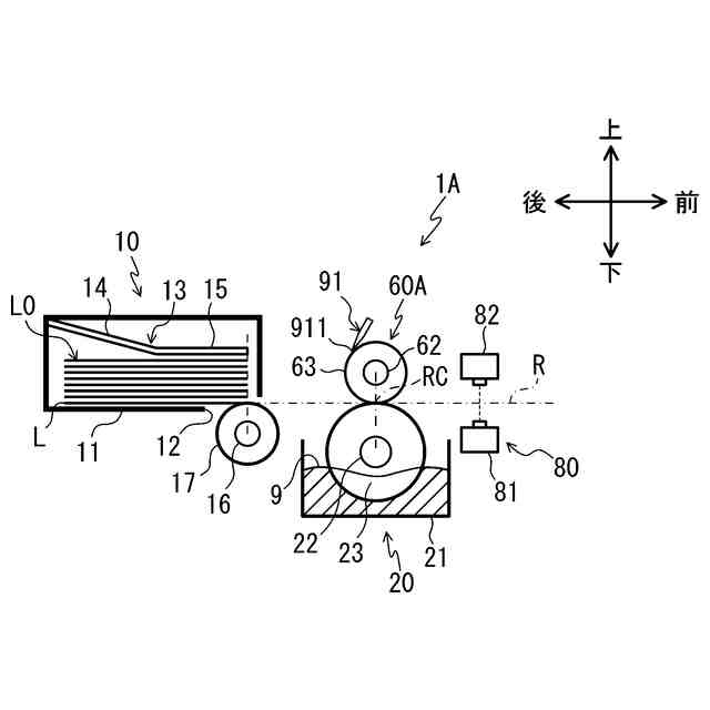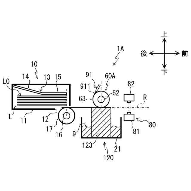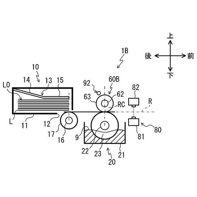 裏面に水活性粘着剤層が設けられたラベルに水を付ける水付け装置が知られている。特許文献1に記載の水付け装置は液槽と、回転ローラと、押圧ばねとを有する。液槽は水を収容する。回転ローラは液槽内に水平に軸支した回転軸の周りを回転可能である。押圧ばねは回転ローラの上方に設けられ、回転ローラに上方から接触する。回転ローラを回転してラベルを搬送すると、回転ローラと押圧ばねとの間でラベルが挟持され、回転ローラに付着した液槽の水がラベルの裏面に付けられる。