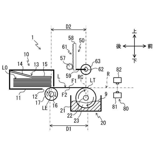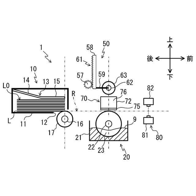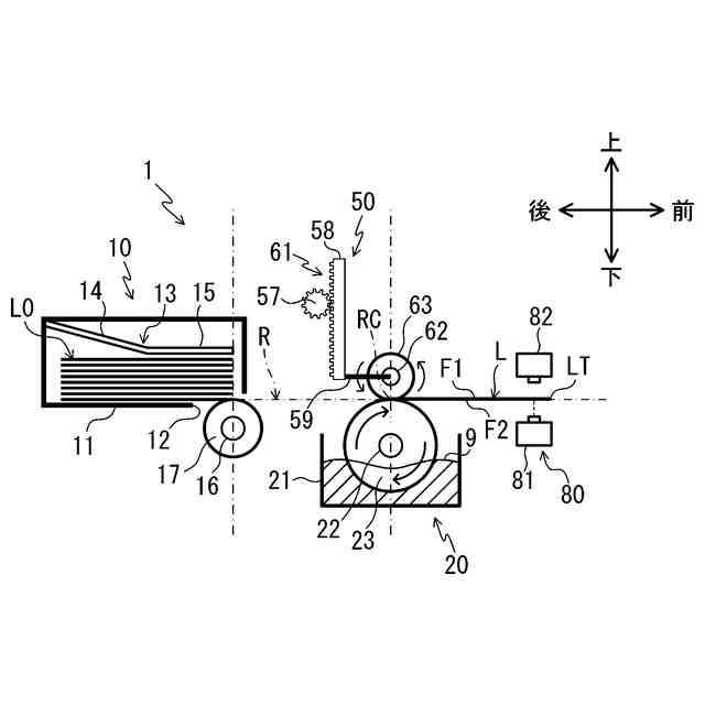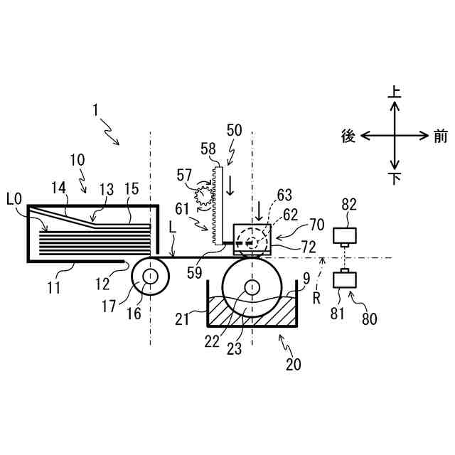 裏面に水溶性粘着剤層が設けられたラベルに水を付ける水付け装置が知られている。特許文献1に記載の水付け装置は液槽と、回転ローラと、押圧ばねとを有する。液槽は水を収容する。回転ローラは液槽内に水平に軸支した回転軸の周りを回転可能である。押圧ばねは回転ローラの上方に設けられ、回転ローラに上方から接触する。回転ローラを回転してラベルを搬送すると、回転ローラと押圧ばねとの間でラベルが挟持され、回転ローラに付着した液槽の水がラベルの裏面に付けられる。