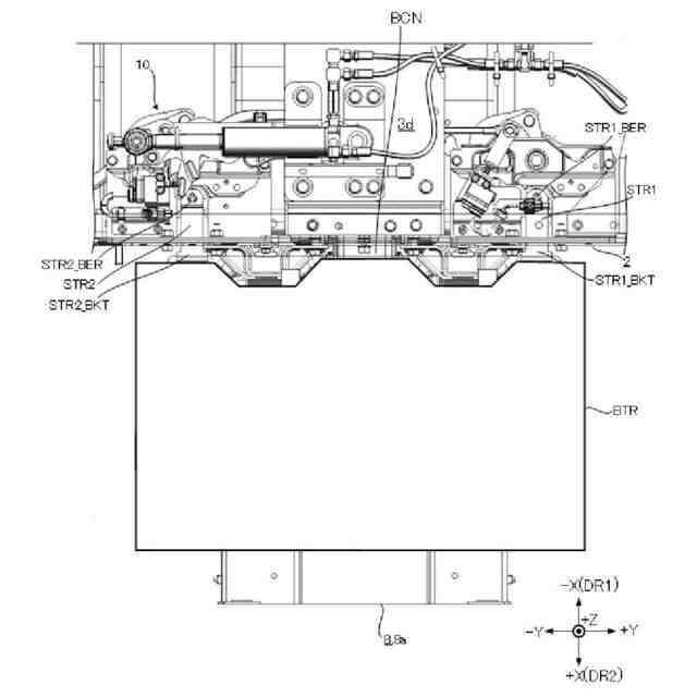 【解決手段】バッテリの支持構造は、バッテリが水平面に沿う一方向に引き込まれた状態で車両に支持されるバッテリの支持構造であって、一方向に対して直交かつ水平面に沿う方向の一側に傾斜し、バッテリが引き込まれた場合、バッテリ側と車両側との間に挟まれて圧縮変形に対する復元力が生じる第1弾性面を有する第1弾性体と、一側とは反対の他側に傾斜し、バッテリが引き込まれた場合、バッテリ側と車両側との間に挟まれて圧縮変形に対する復元力が生じる第2弾性面を有する第2弾性体と、を備える。
