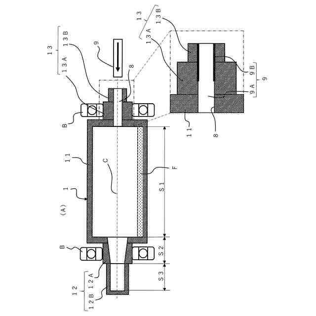 図1(A)に示すロータシャフト1は、回転電機であるモータMのロータRを構成している。なお、図1(A)は、ステータSの片側半分を省略したモータの断面図であり、図1(B)は、図1(A)中のA-A線矢視に基づく断面図である。
