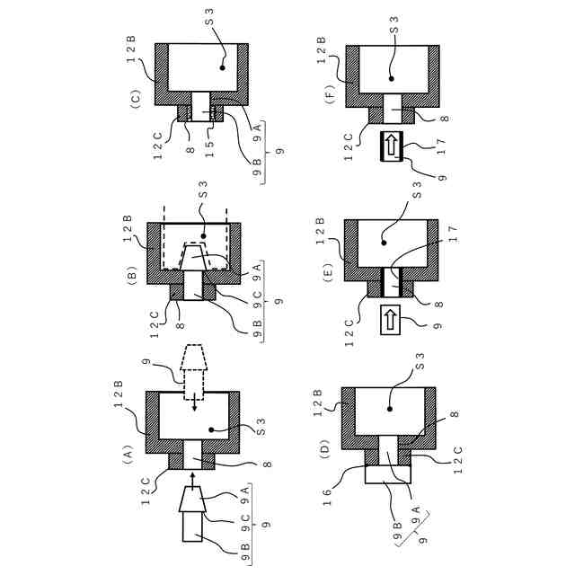 ロータシャフトの第3実施形態を示す断面図(A,B)、第4実施形態を示す断面図(C)、第5実施形態を示す断面図(D)、及び第6実施形態を示す断面図(E,F)である。