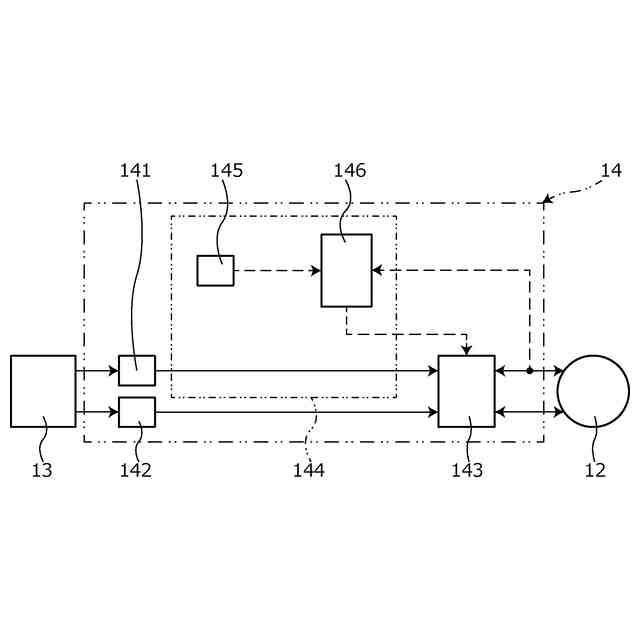 前記制御部14は、正転スイッチ141および逆転スイッチ142と、回転指令部143と、回転制御部144とから構成されている。前記正転スイッチ141および逆転スイッチ142は、それぞれ前記筐体11の外周面に設けられた押しボタン式スイッチを有しており、作業者が当該押しボタン式スイッチを押している間、電池13から供給された電力を下流に設けられた回転指令部143に向けて出力し続けるよう構成されている。前記回転指令部143は、前記電池13から供給された電圧をDCモータ12に適するものに変換する変換回路と、前記正転スイッチ141が押された場合、正転駆動するようDCモータ12と電池13とを接続する一方、前記逆転スイッチ142が押された場合、逆転駆動するようDCモータ12と電池13とを接続する制御回路(図示せず)を備えている。なお、本実施形態の制御回路は、正転スイッチ141および逆転スイッチ142いずれからも押されていない状態では、DCモータ12を停止させるよう構成されている。