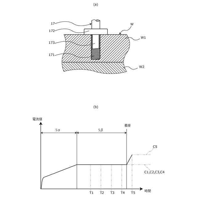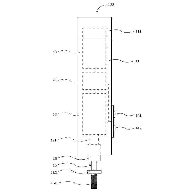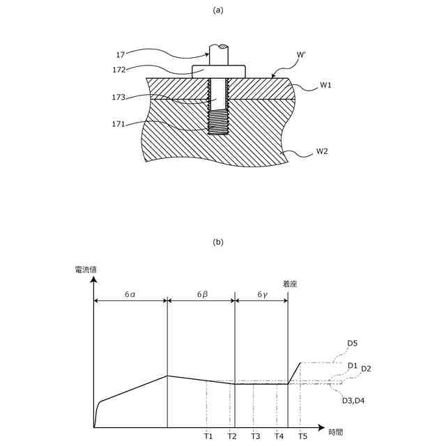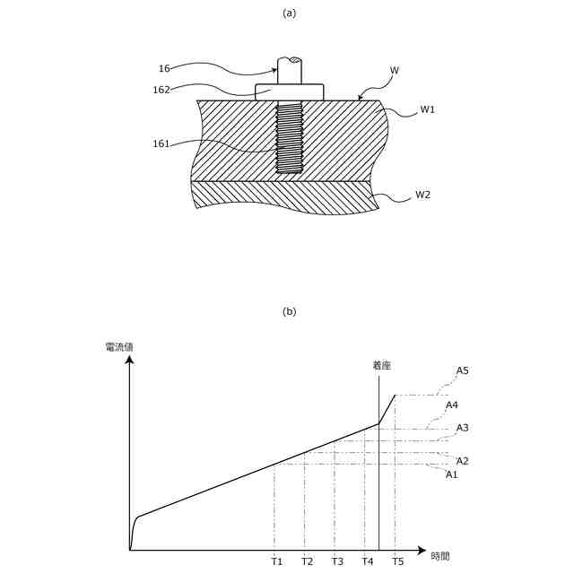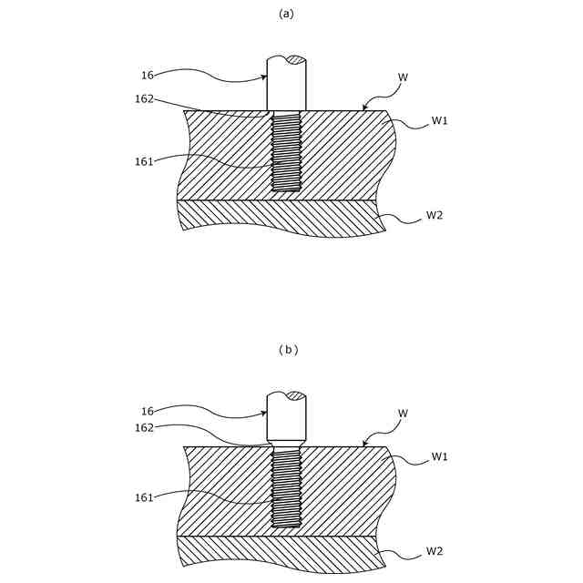 以下、本発明の第一の実施形態を図面に基づき説明する。図1において10は、骨Wに形成された下穴にめねじを切削する医療用電動タッパーの一例である。この医療用電動タッパー10は、作業者が把持可能な円筒形状の筐体11を有しており、この筐体11の内部には、DCモータ12と、このDCモータ12に電力供給する電池13と、電池13とDCモータ12とを接続する制御部14が収容されている。また、前記DCモータ12の出力軸121には、把持チャック15が連結されている。この把持チャック15は、その先端部が前記筐体11から突出しており、この把持チャック15には、タップビット16が把持されている。このタップビット16は、先端に設けられたおねじ形状のタップ部161と、このタップ部161より基端側に設けられたタップ部161より大きいストッパ162を有している。このため、図3の(a)に示すようにタップ部161が所定の深さまで骨Wに侵入すると、前記ストッパ162は、骨Wの表面に当接してする。さらに、前記筐体11は、タップビット16と逆側の端部が着脱可能に構成された蓋部材111となっており、前記電池13は、蓋部材111側に収容されている。このため、蓋部材111を外すことにより、前記電池13を容易に取り出しおよび交換可能となる。