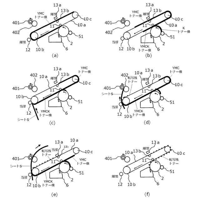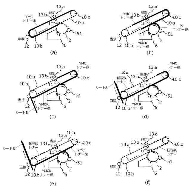 この一次転写同時クリーニング方式では、二次転写後の残トナーは感光ドラムを経て、感光ドラムのクリーニングユニットに回収される。このため、中間転写体の残トナーを回収する廃トナー容器の容量を最小限にでき、また中間転写体をブレードなどで強く摺擦しないため中間転写体の長寿命化が図れるという利点がある。