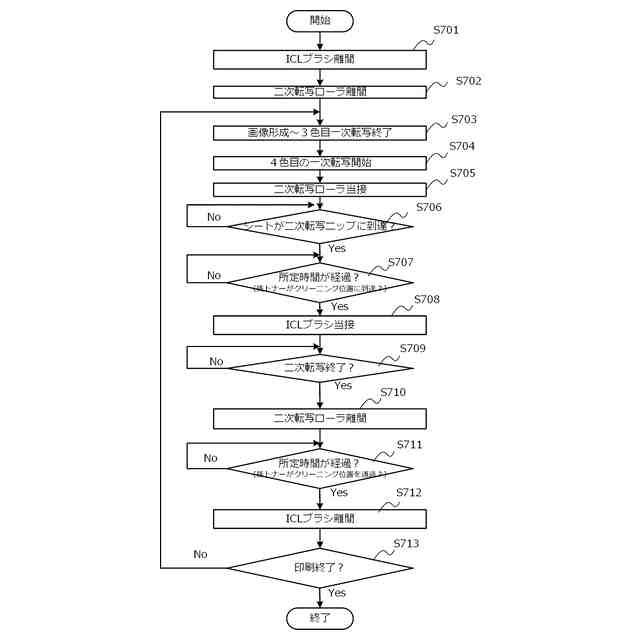ところで上述した一次転写同時クリーニング方式では、ICL手段は、二次転写後の残トナーを感光ドラムの帯電電位と逆電位に帯電させることを目的としているものの、帯電しきれずにICL手段に回収、保持されるトナーが存在する。例えばICL手段がブラシである場合、中間転写体上の二次転写後の残トナーは、感光ドラムの帯電電位と逆電位が印加されたブラシに到達する。そしてその残トナーは、感光ドラムの帯電電位と逆電位に帯電されてブラシを通過していくトナーと、感光ドラムの帯電電位と逆電位まで帯電しきれずにブラシに絡み取られてブラシに保持されるトナーとに分かれる。そしてブラシに保持されたトナーは、所定のタイミングでブラシに電圧を印加することで中間転写体上へ吐き出され一次転写ニップで感光ドラムに回収される。但し、このとき、ブラシに保持された全てのトナーが吐き出されることはなく、そのブラシには、ある程度のトナーが保持された状態になっている。この保持されたトナーが、画像形成中の意図しないタイミングで中間転写体に飛散すると、飛散したトナーは一次転写ニップを通過し、二次転写ニップにおいて二次転写部材を汚染したり、記録媒体に汚れを転写して画像不良として顕在化する可能性があった。上述したブラシからのトナーの飛散は、ブラシが中間転写体に接触していて、かつ中間転写体の搬送速度が変化するときに発生しやすい。