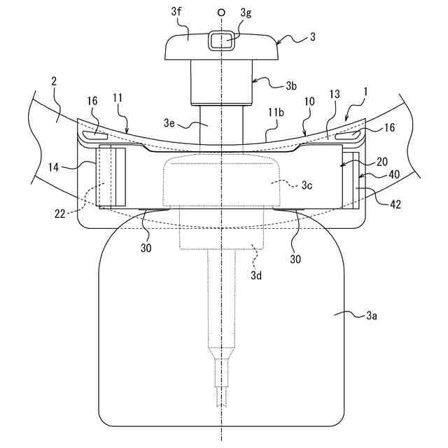 【解決手段】ベルト係合部11と本体側ポンプ嵌合部12とを備えた合成樹脂製の本体部10と、カバー側ポンプ嵌合部21を備え、本体部10に開閉自在に取り付けられた合成樹脂製のカバー部20と、本体部10に設けられ、カバー部21の下端に当接する合成樹脂製の支持壁30と、本体部10及びカバー部20の何れか一方に設けられ、何れか他方に設けられた係止突起15に係合してカバー部20を閉じた状態に保持する爪部41と、押圧されることで爪部41の係止突起15への係合を解除する操作部42と、を備えた合成樹脂製のレバー40と、を有し、本体側ポンプ嵌合部12とカバー側ポンプ嵌合部21との間にキャップ3cを嵌合させてポンプ付きボトル3を保持するように構成されているポンプ携帯ホルダー1。