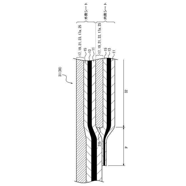 上記[1]に記載の構成において、前記オーバーラップ部における径方向内側の積層シートの周方向側端部から、少なくとも前記明色層及び前記暗色層が周方向外側にはみ出していることが好ましい。