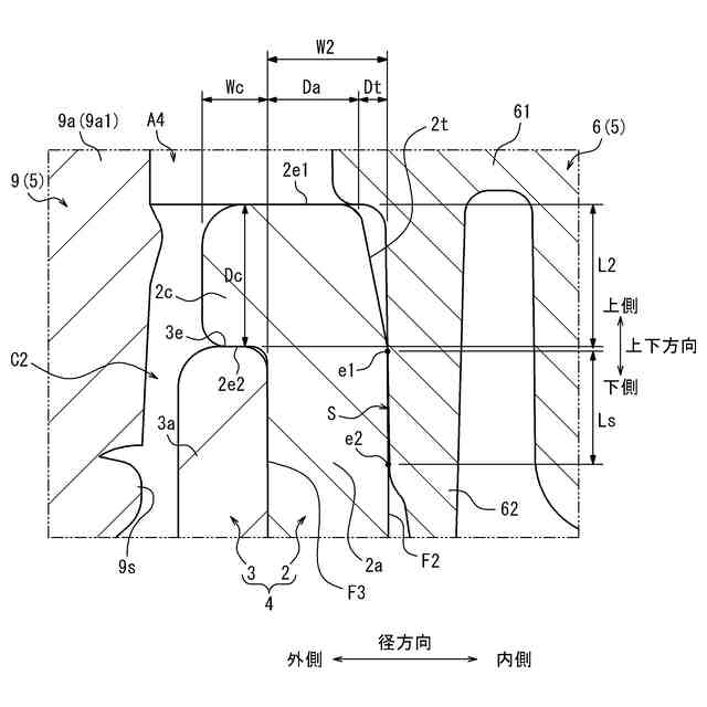 (2)上記(1)の吐出容器において、前記内容器の口部の内周面のうち、前記鍔部が位置する当該内容器の口部の内周面は、下側に向かうにしたがって径方向内側に向かって傾斜するテーパ面であることが好ましい。