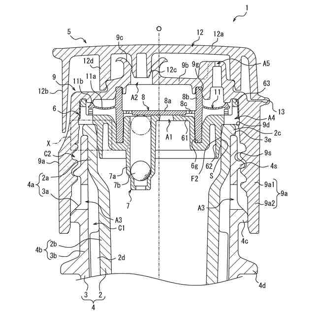 (4)上記(1)~(3)のいずれか1つの吐出容器において、前記吐出キャップは、前記内容器に通じる流通孔がサックバック機構とともに設けられた中栓と、前記中栓の流通孔を開閉可能な吐出弁と、前記吐出弁を介して前記流通孔に通じる吐出孔が設けられているとともに前記外容器の口部に取り付けられたキャップ本体と、前記外容器の口部に設けられた通気孔と前記キャップ本体に設けられた外気導入孔との間を開閉可能な外気導入弁と、を備えており、前記シール部は、前記中栓に設けられているものとすることができる。