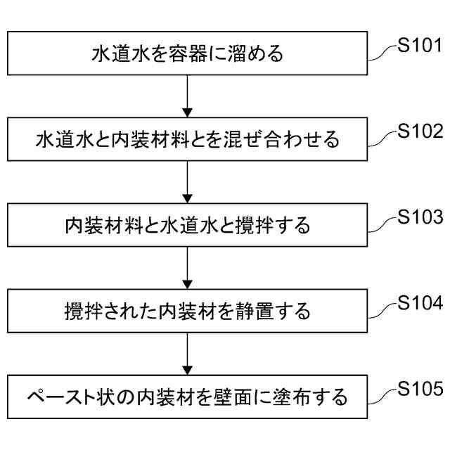 また、本開示は、上記課題を解決するものであり、水道水と粉状の珪藻土および緑色片岩とを混ぜ合わせる混合工程と、前記珪藻土、前記緑色片岩および前記水道水を攪拌してペースト状の内装材を作る攪拌工程と、前記内装材を施工面に塗布する塗布工程と、を含むことを特徴とする施工方法である。