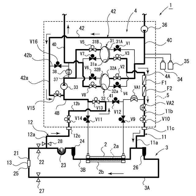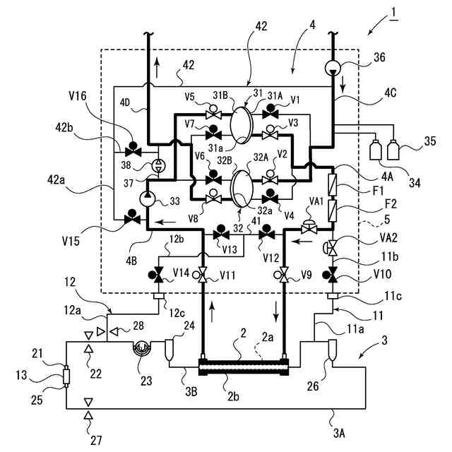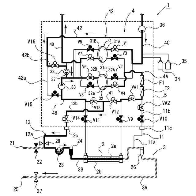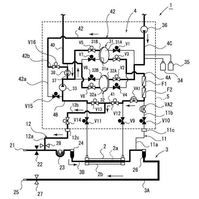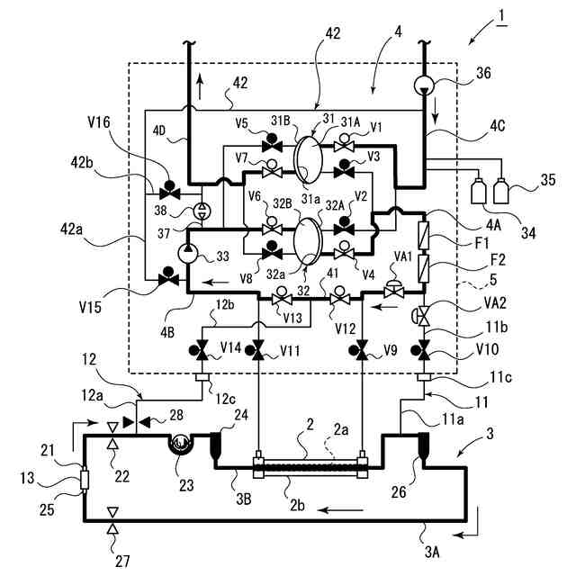 上記透析器2は、筒状のハウジング2bの内部に無数の血液浄化膜としての中空糸2aを収容した構成を有しており、当該中空糸2aの内側が血液回路3に連通して血液が流通するとともに、ハウジング2b内の中空糸2aの外側が透析液回路4に連通して透析液が血液とは逆方向に流通するようになっており、透析治療時には中空糸2aの内側を流れる血液と外側を流れる透析液との間で血液透析が行われるようになっている。