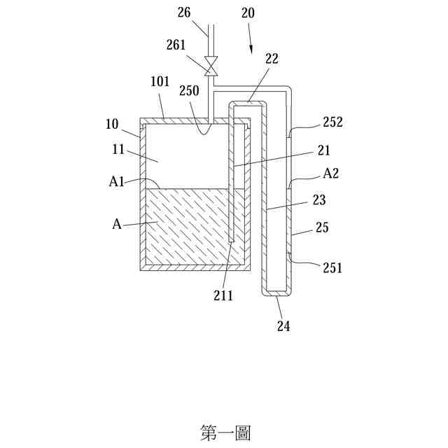前記容器は、管体を有し、前記管体は、第1の段部、第1の折り曲げ部、第2の段部、第2の折り曲げ部及び透視可能な第3の段部を含み、前記第1の段部は、一端に第1の開口部を設け、他端に前記第1の折り曲げ部を接続させ、前記第1の折り曲げ部の他端は、前記第2の段部の一端に接続させ、前記第2の段部の他端は、前記第2の折り曲げ部に接続させ、前記第2の折り曲げ部の他端は、前記第3の段部の一端に接続させ、前記第3の段部の他端には、第2の開口部を設け、液体は、前記第1の開口部を介して前記第3の段部まで流れ、前記第3の段部に形成された前記第1の液位と同じ高さで揃った第2の液位により、前記容器内の液体の液面高さを判断することが好ましい。